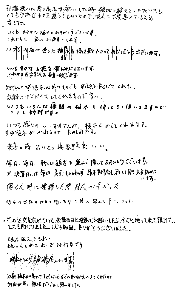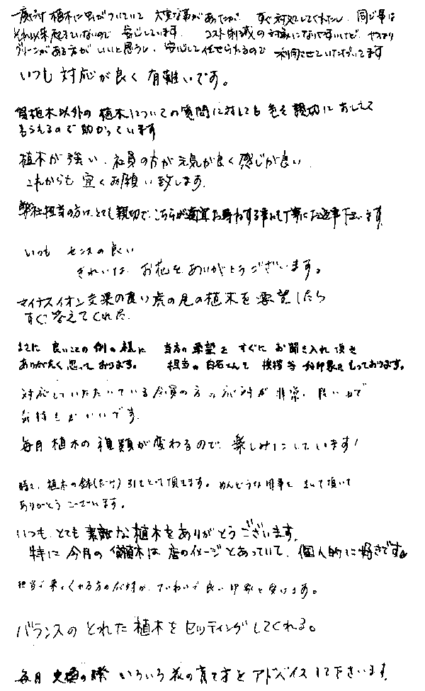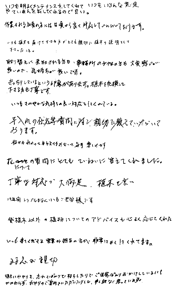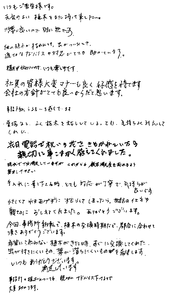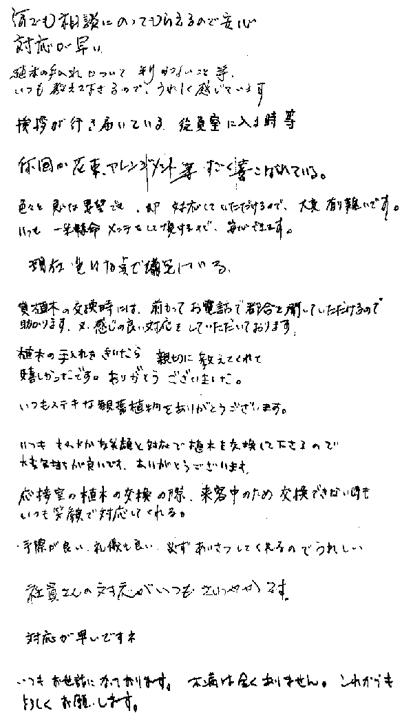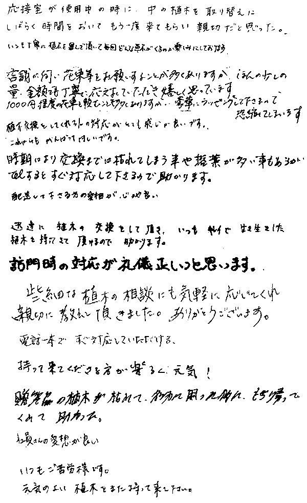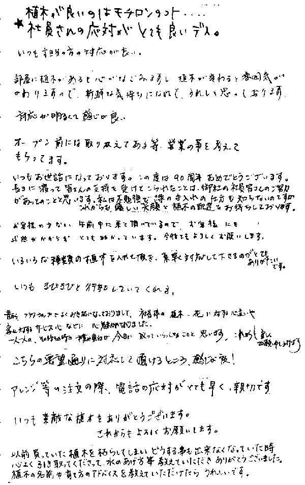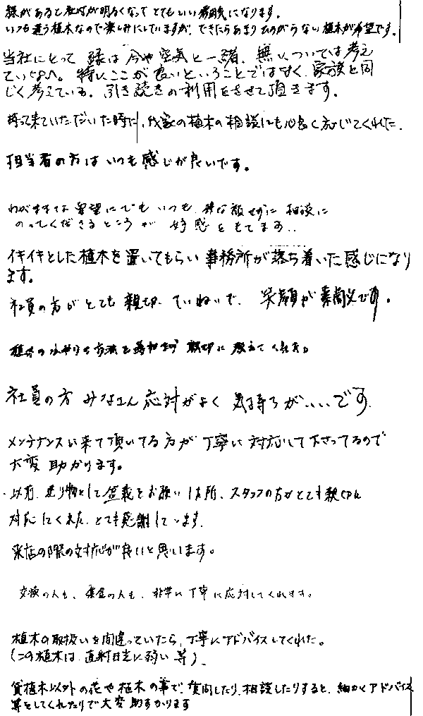 創業90周年を機会に、よりいっそうのお客様満足度の向上を図るべく観葉植物レンタルの「お客様アンケート」を実施しお客様の生のお声を多数頂戴いたしました。具体的な会社名は挙げられませんが、お客様の自筆をそのまま掲載しています。